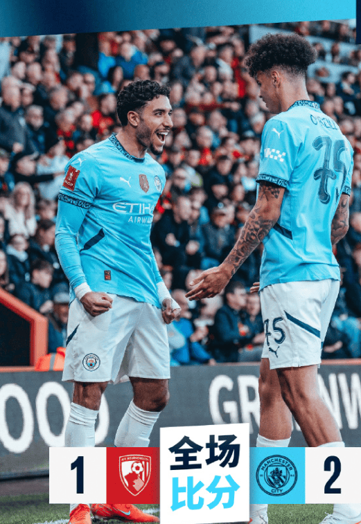 不过,曼城的进攻并未就此停歇,第 63 分钟,奥赖利在前场中路反抢后送出直塞,马尔穆什跟进低射破门,曼城 2-1 反超比分。此后,伯恩茅斯虽全力反扑,但曼城防线稳固,最终将 2-1 的比分保持到终场,成功逆转晋级。